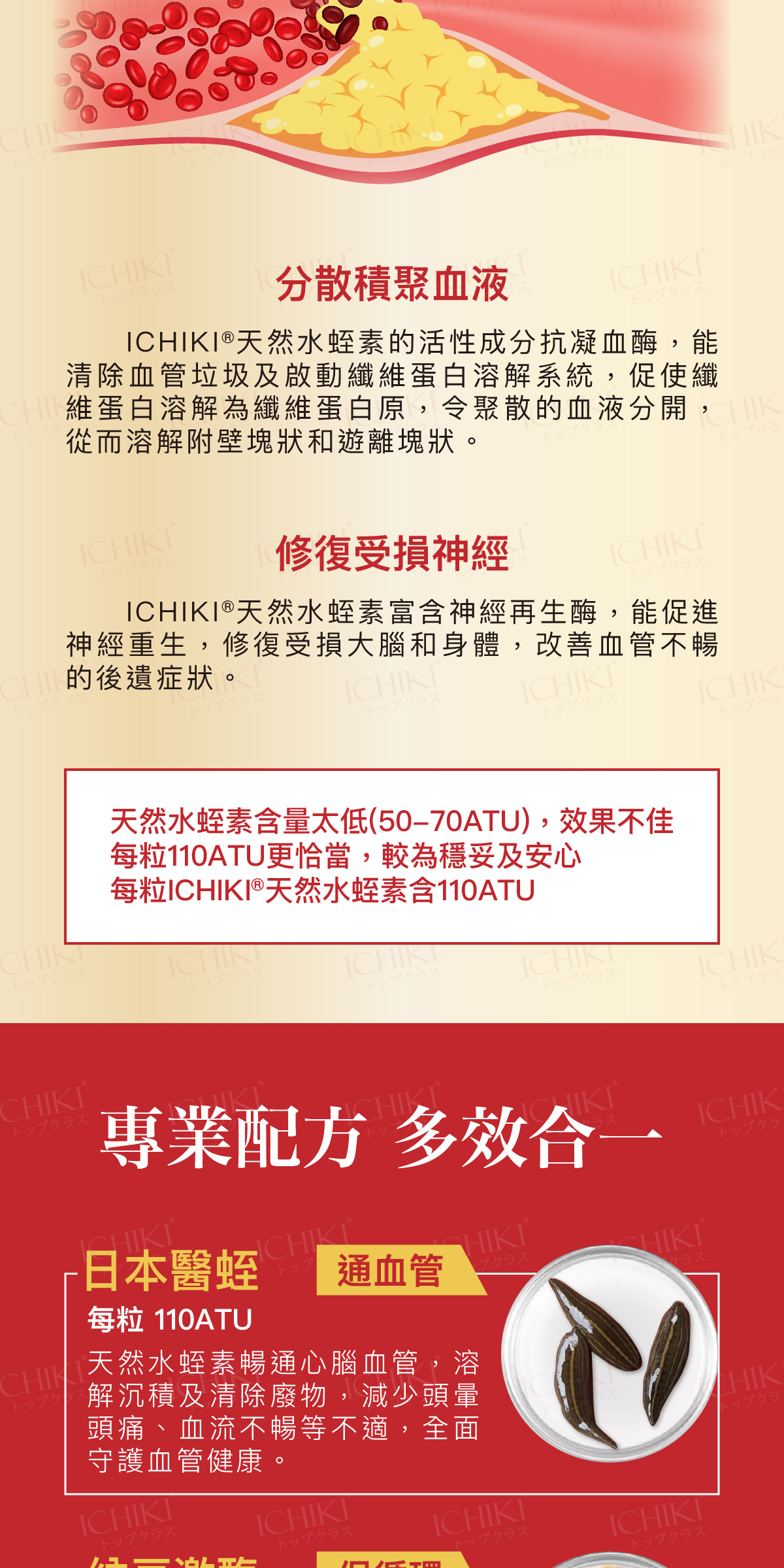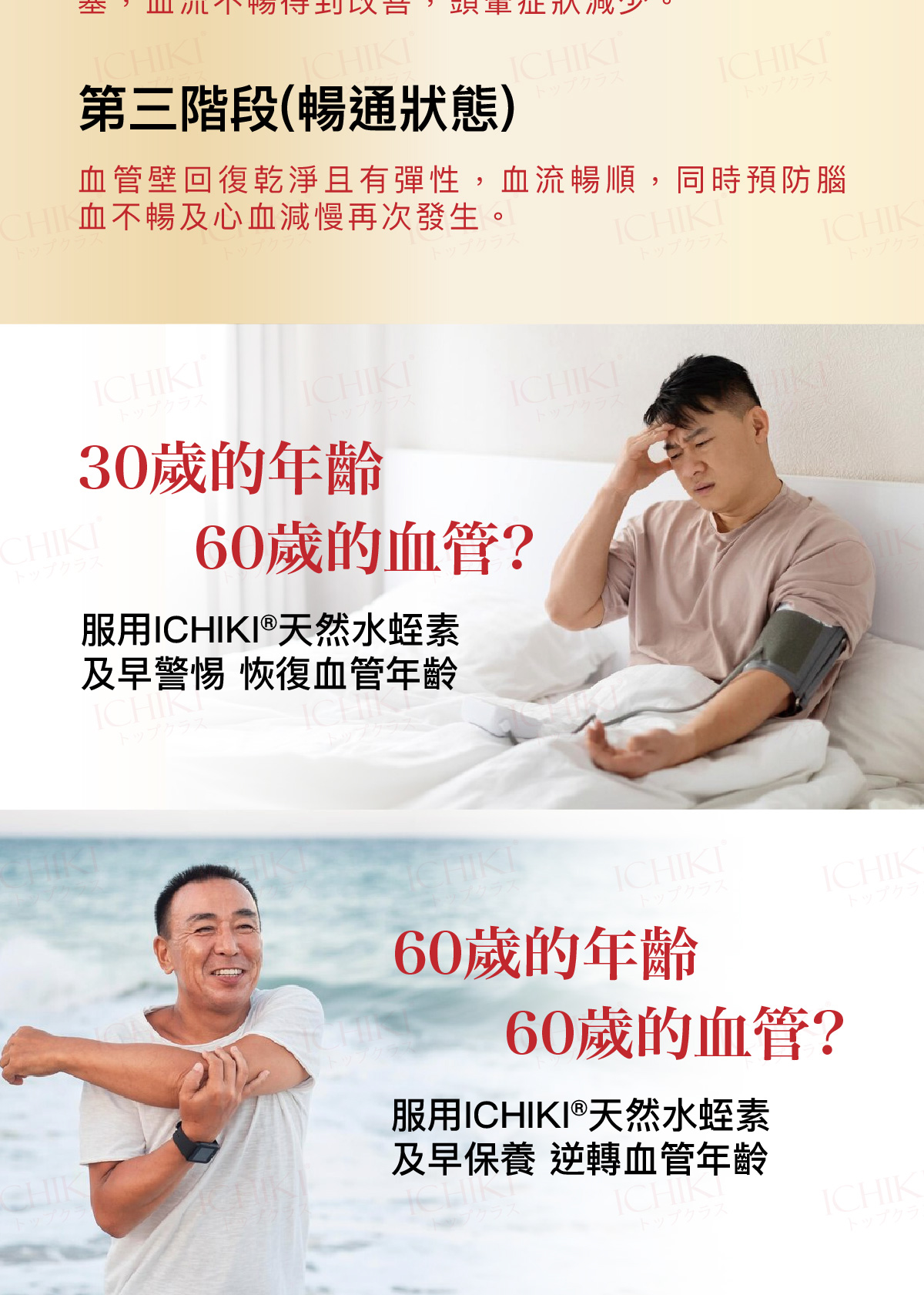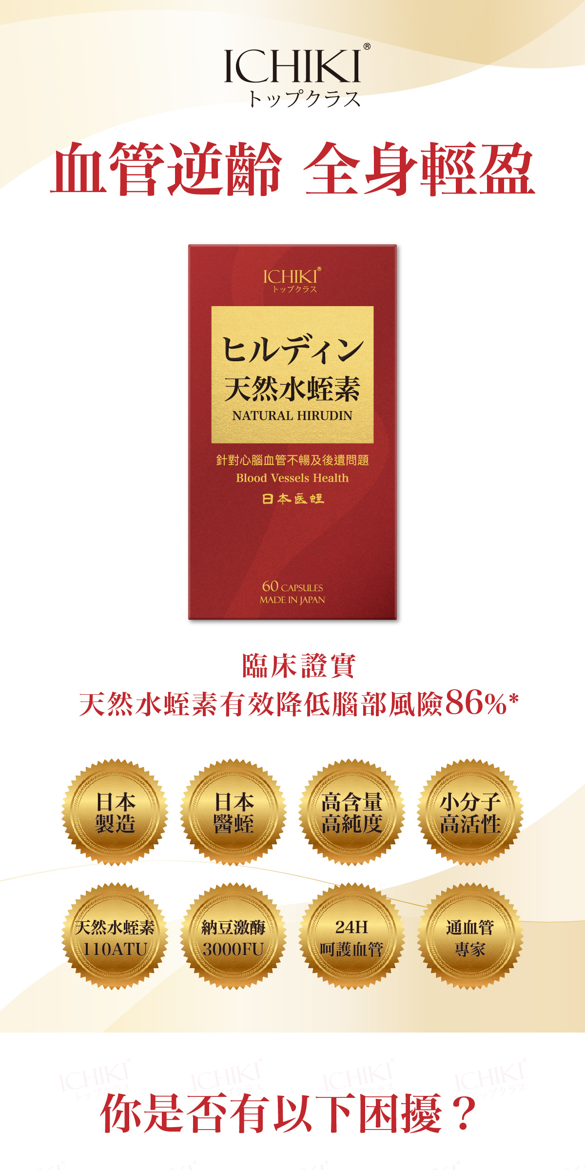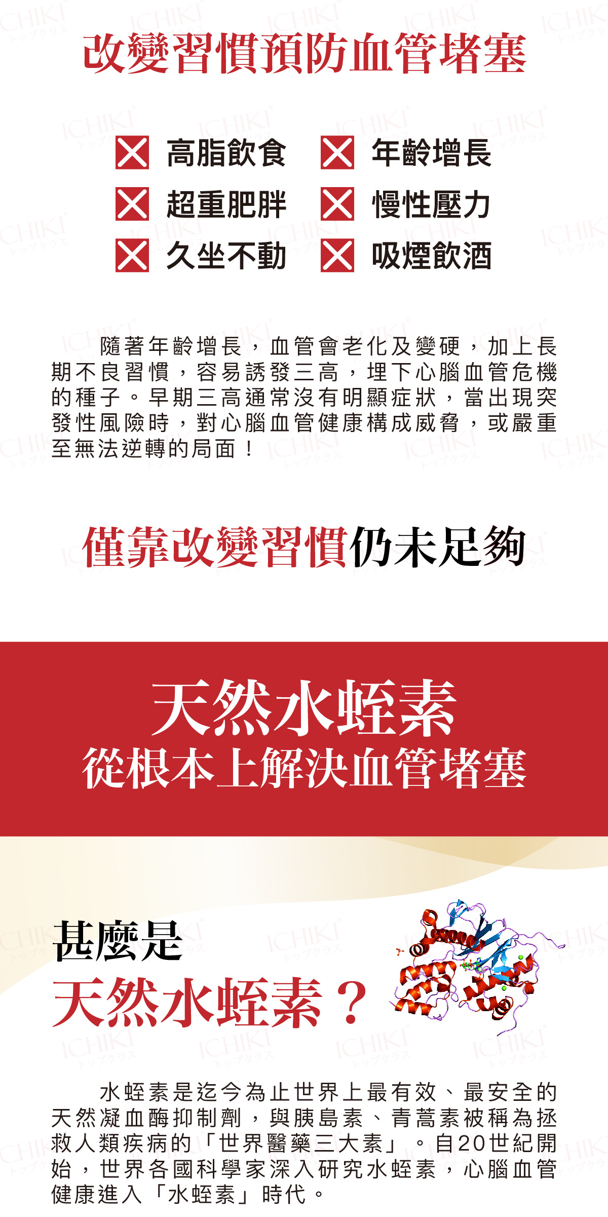 當腦部或心臟血管廢物長期沉積,血流不暢,導致心腦血管壁受損,發作時後果嚴重。ICHIKI®天然水蛭素,快速激活溶解系統,分解血管沉積廢物,修復受損血管壁,增加血管彈性及改善微循環,保持血流暢通,有效逆轉及預防心腦血管不暢造成的健康風險。臨床試驗證實,日本醫蛭水蛭素能有效降低腦部風險高達86%,減少後遺不適