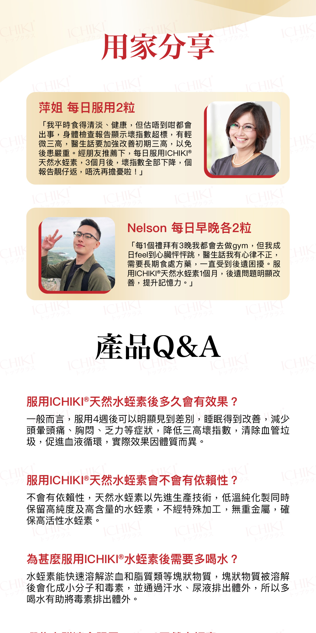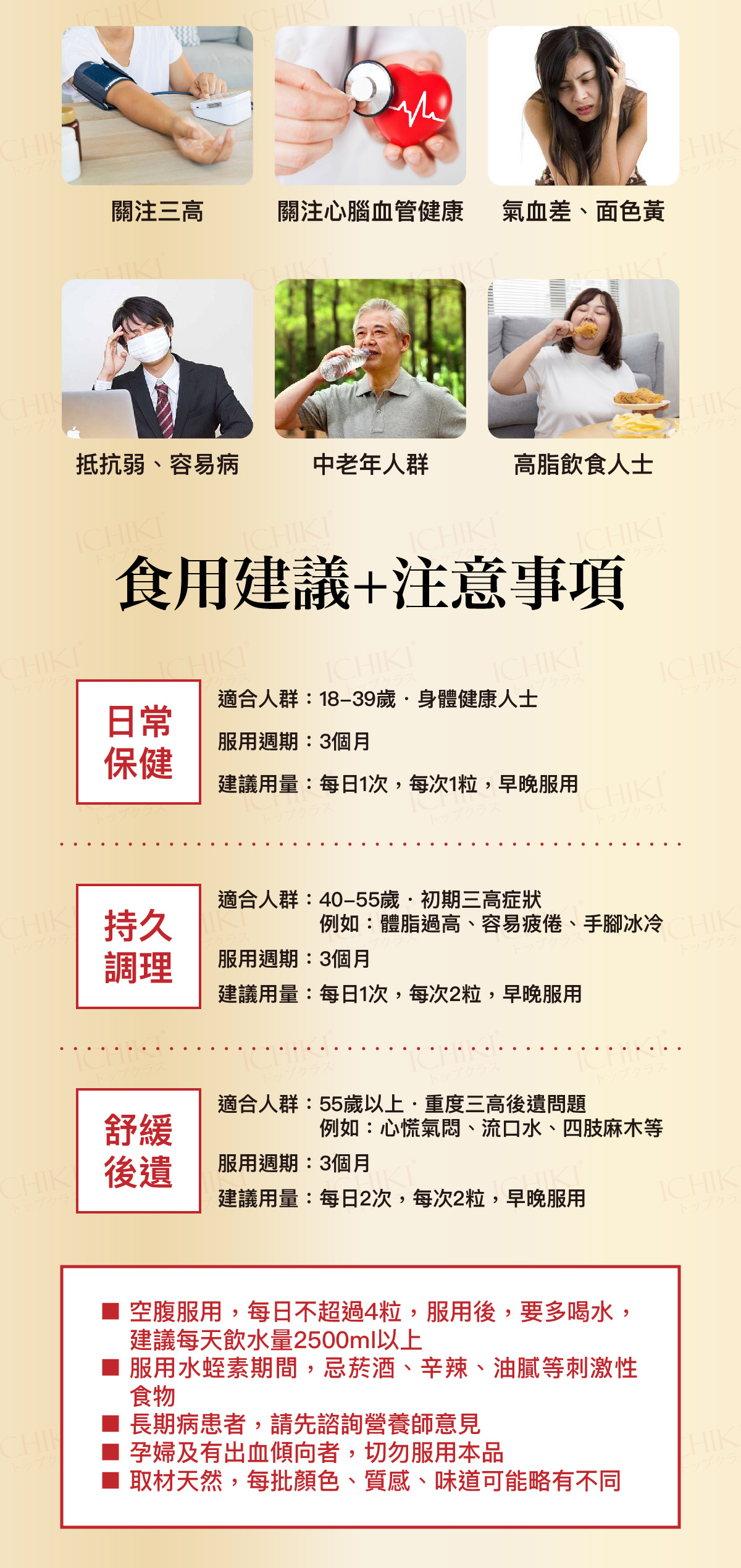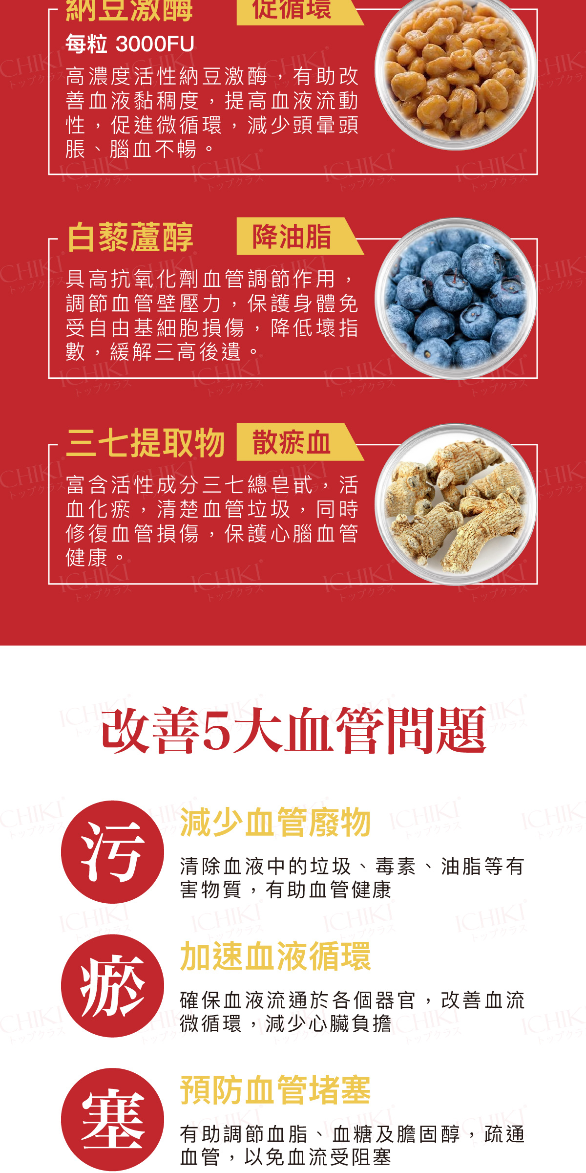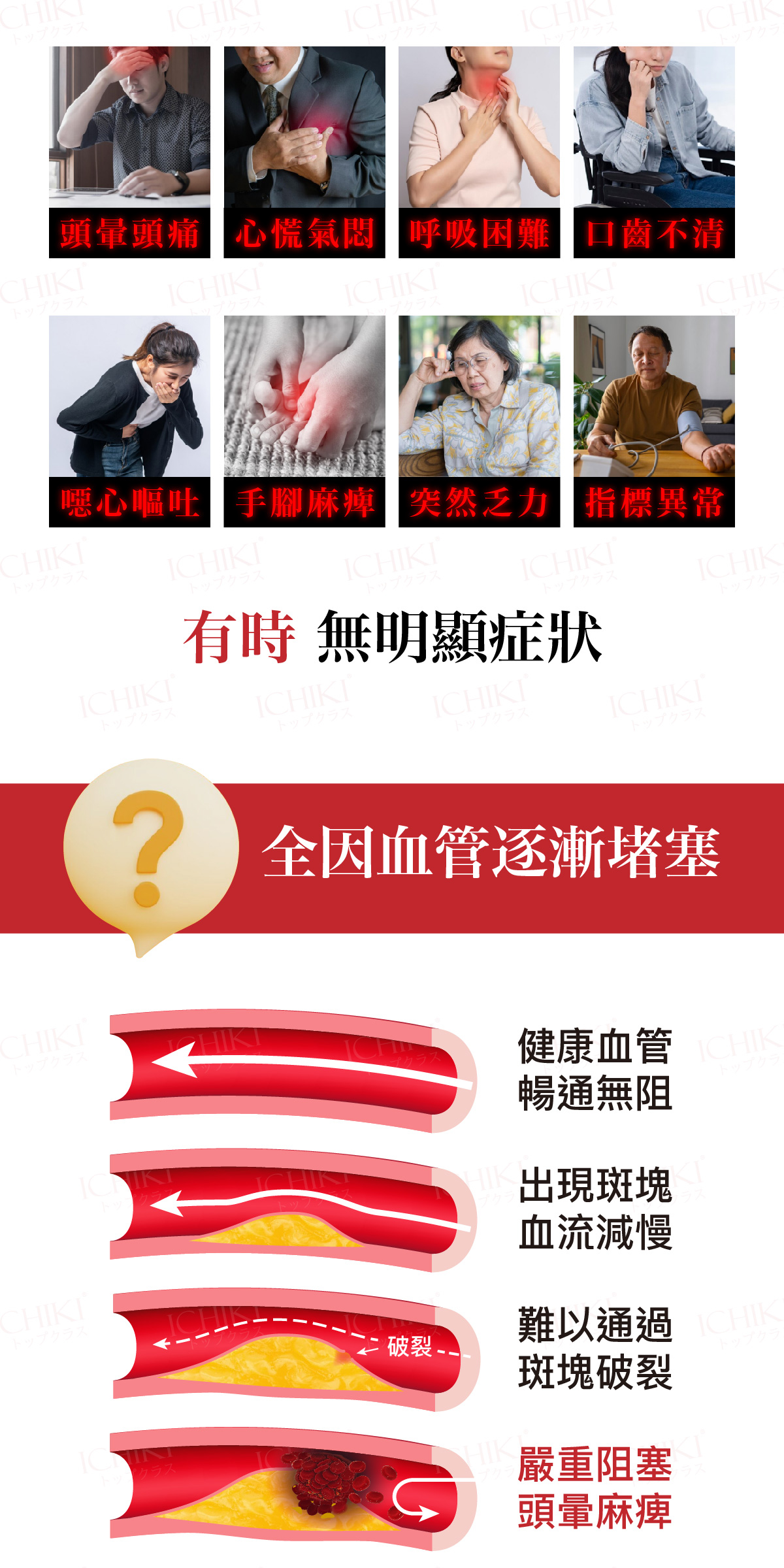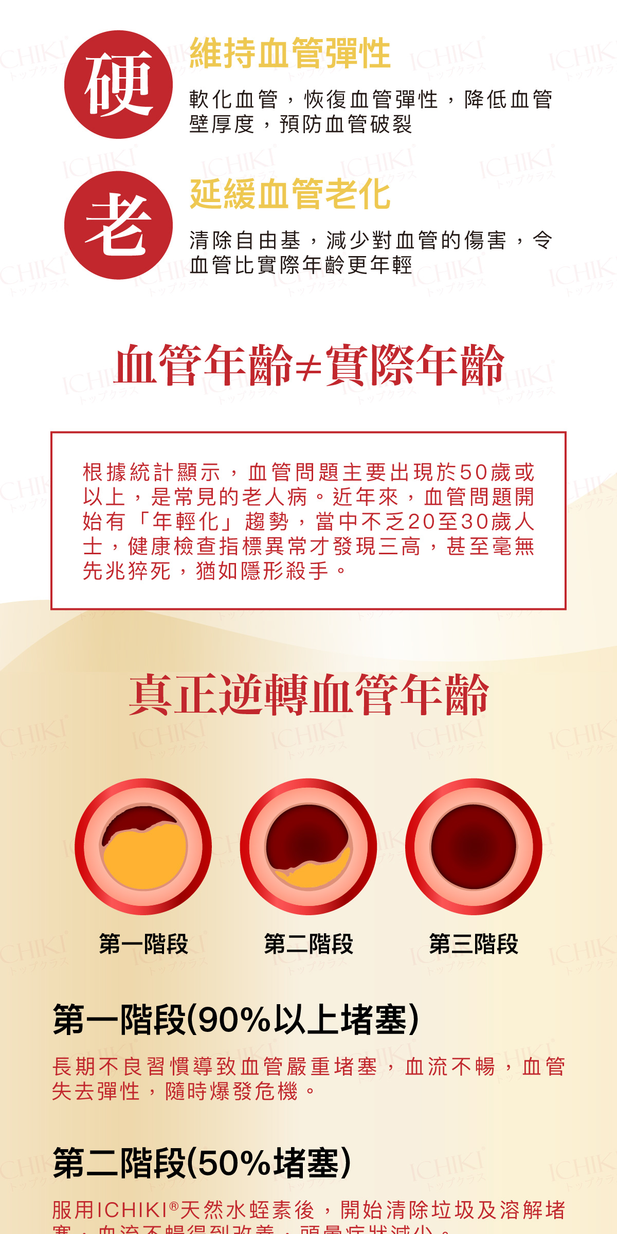 當腦部或心臟血管廢物長期沉積,血流不暢,導致心腦血管壁受損,發作時後果嚴重。ICHIKI®天然水蛭素,快速激活溶解系統,分解血管沉積廢物,修復受損血管壁,增加血管彈性及改善微循環,保持血流暢通,有效逆轉及預防心腦血管不暢造成的健康風險。臨床試驗證實,日本醫蛭水蛭素能有效降低腦部風險高達86%,減少後遺不適